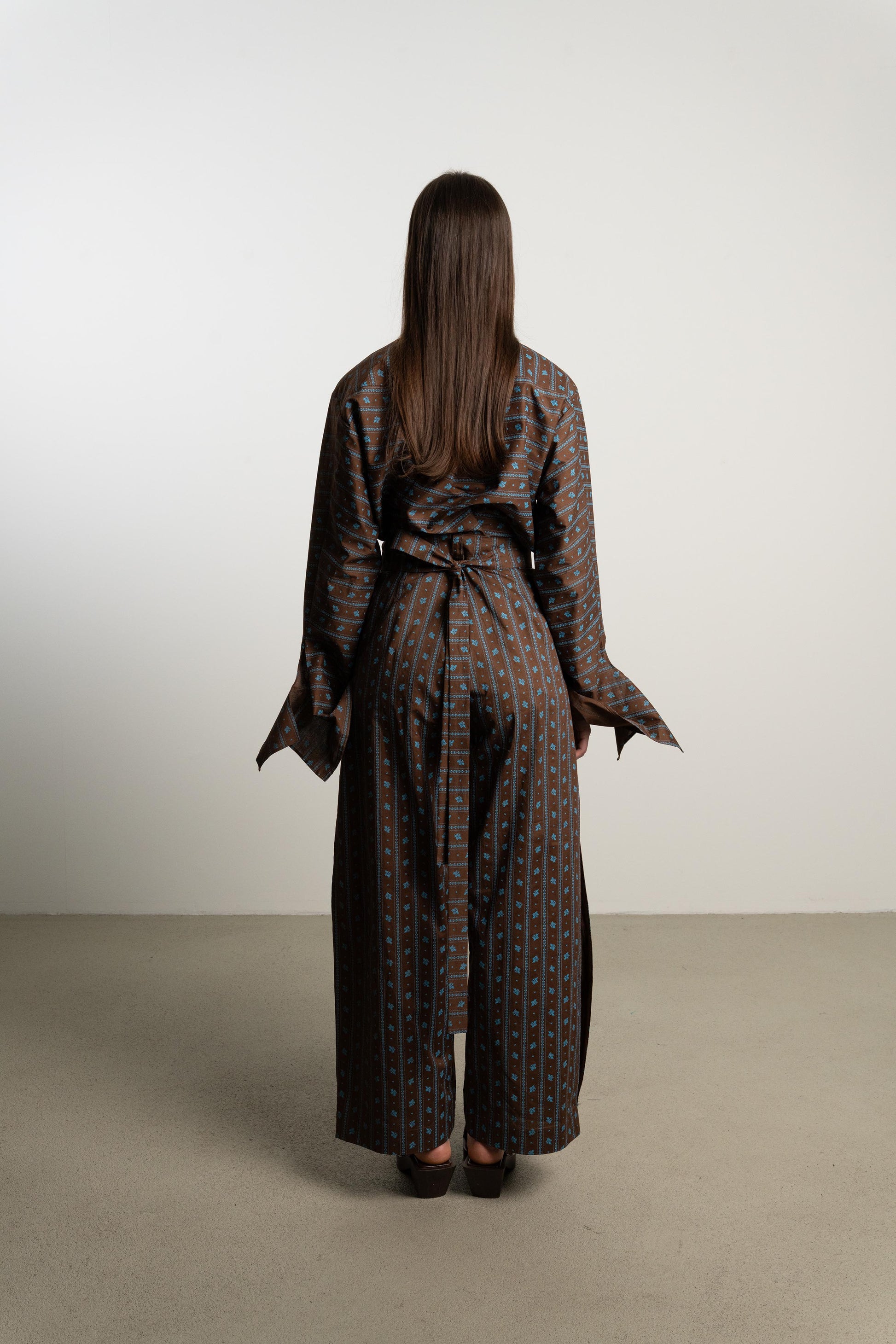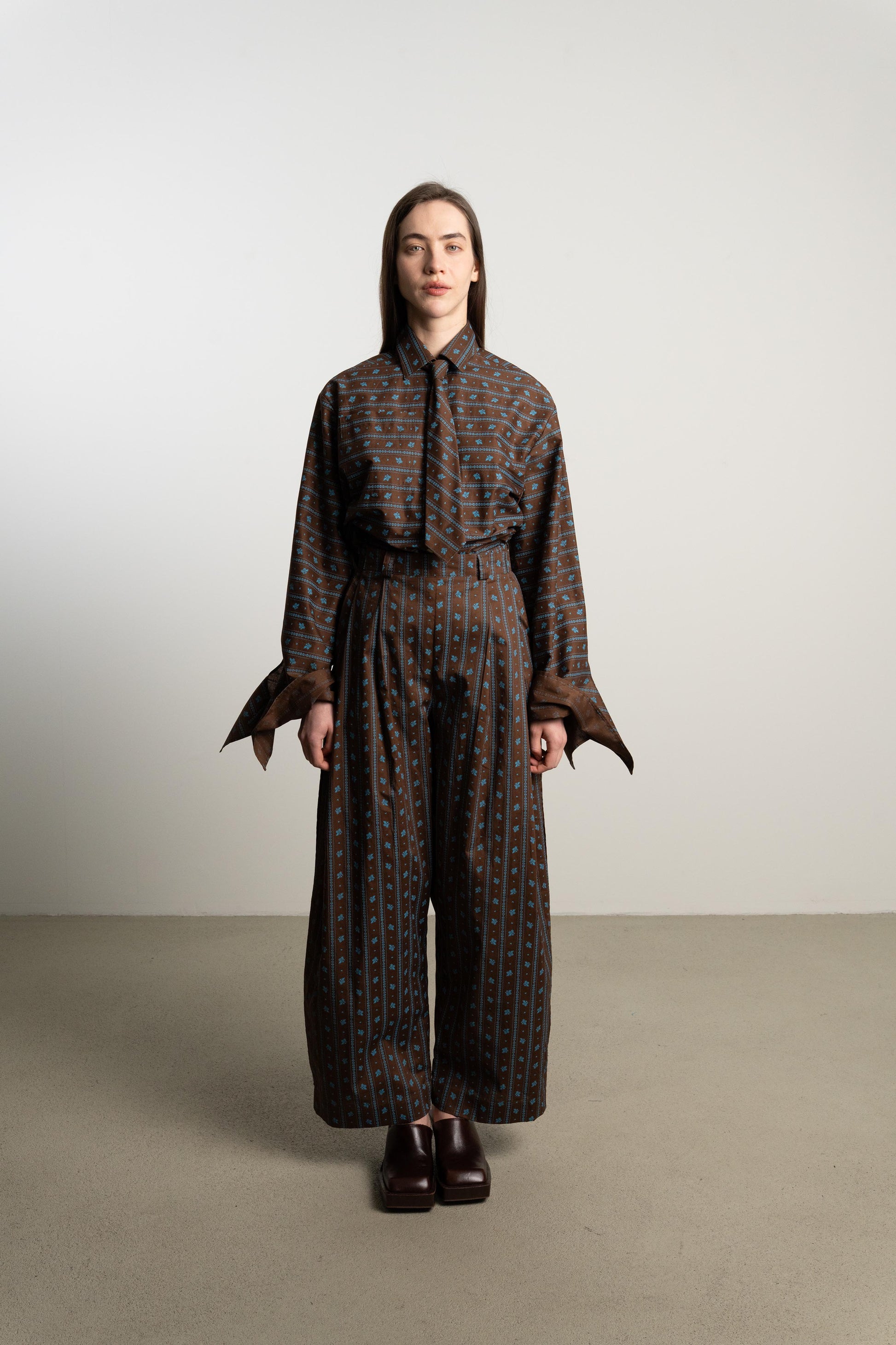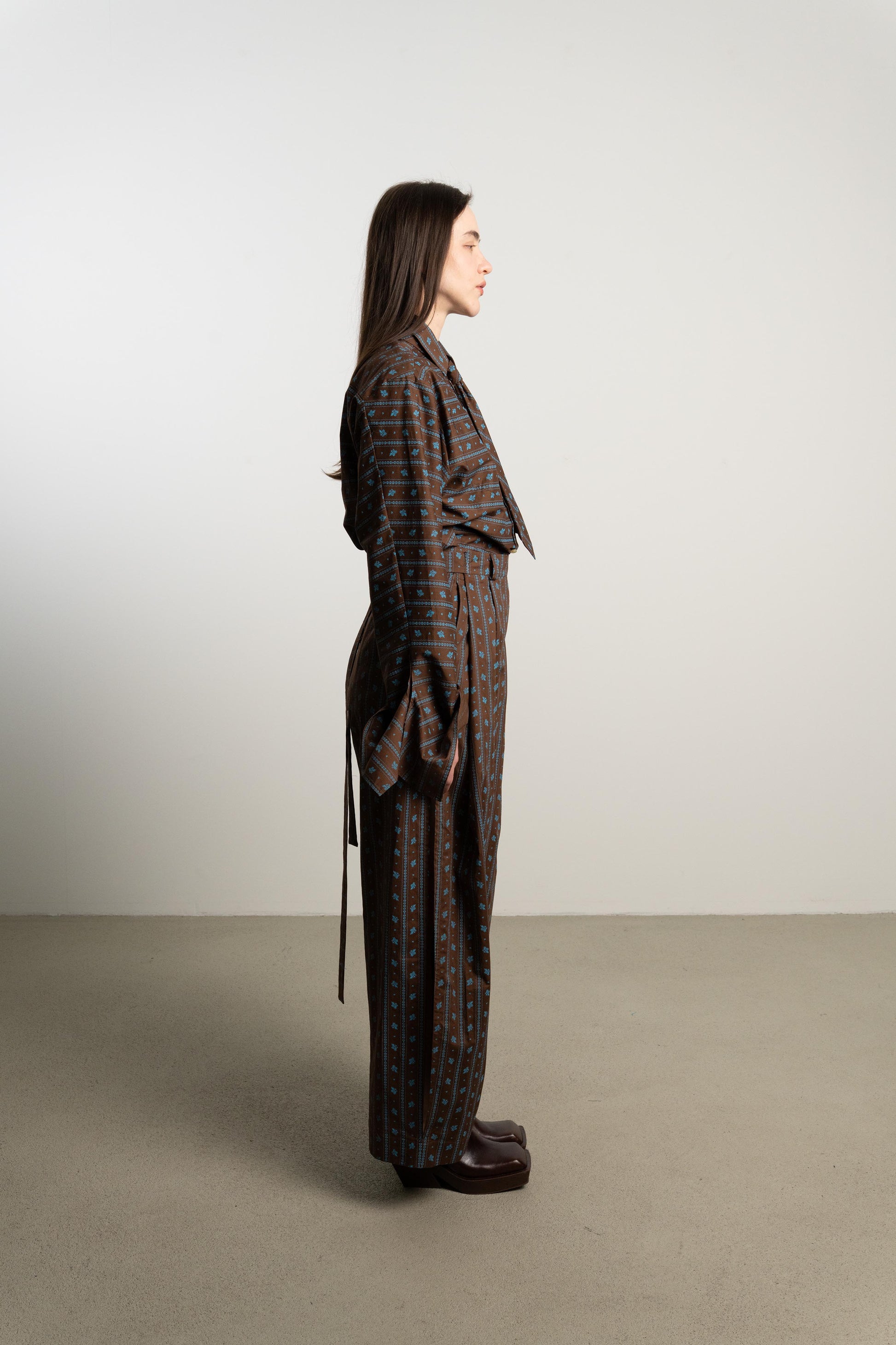 oversized cut, overlong sleeves with bow cuffs, breast pocket, signature button, french seam finishing