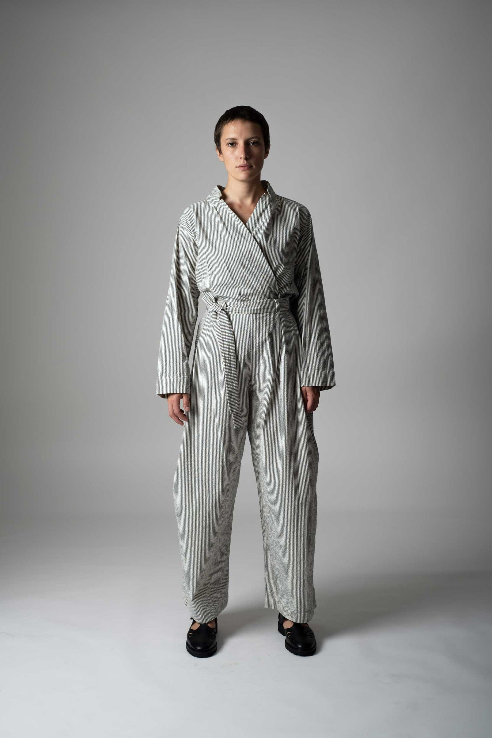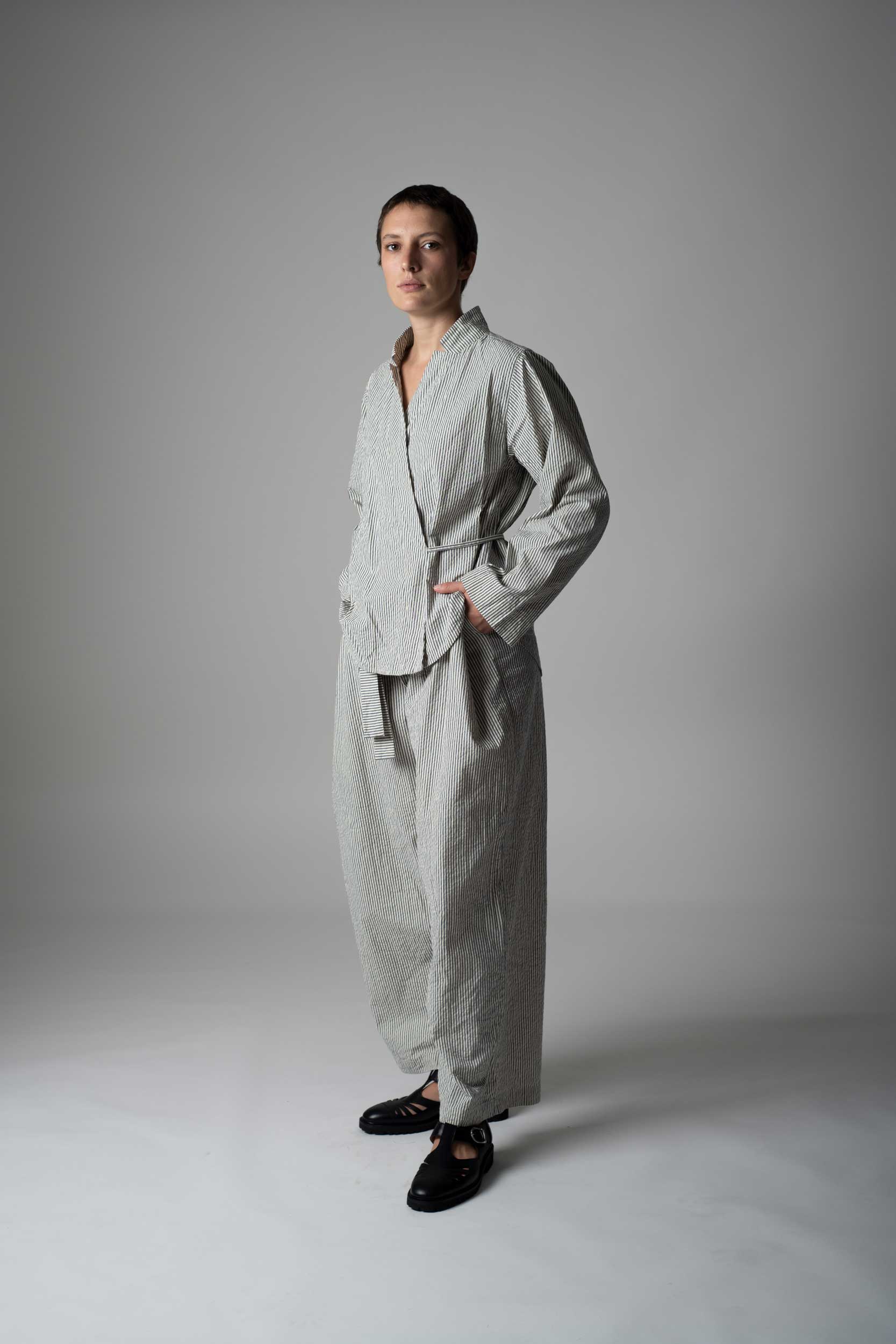 wide foldable pants, front pleats, adjustable to size with inside straps and outside tie belt, side seam pockets