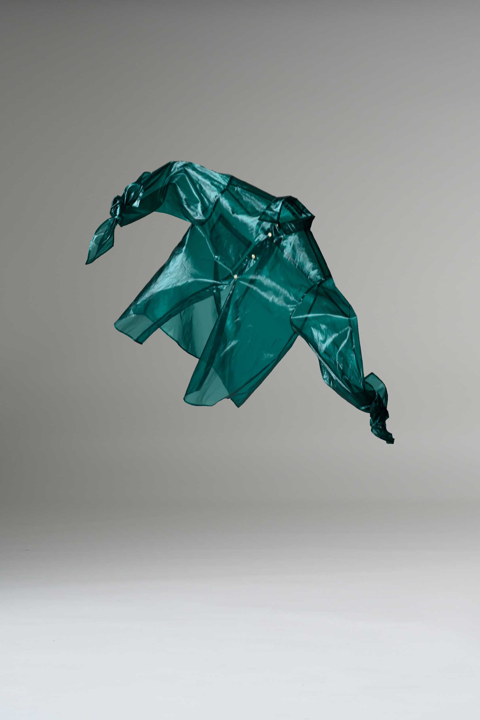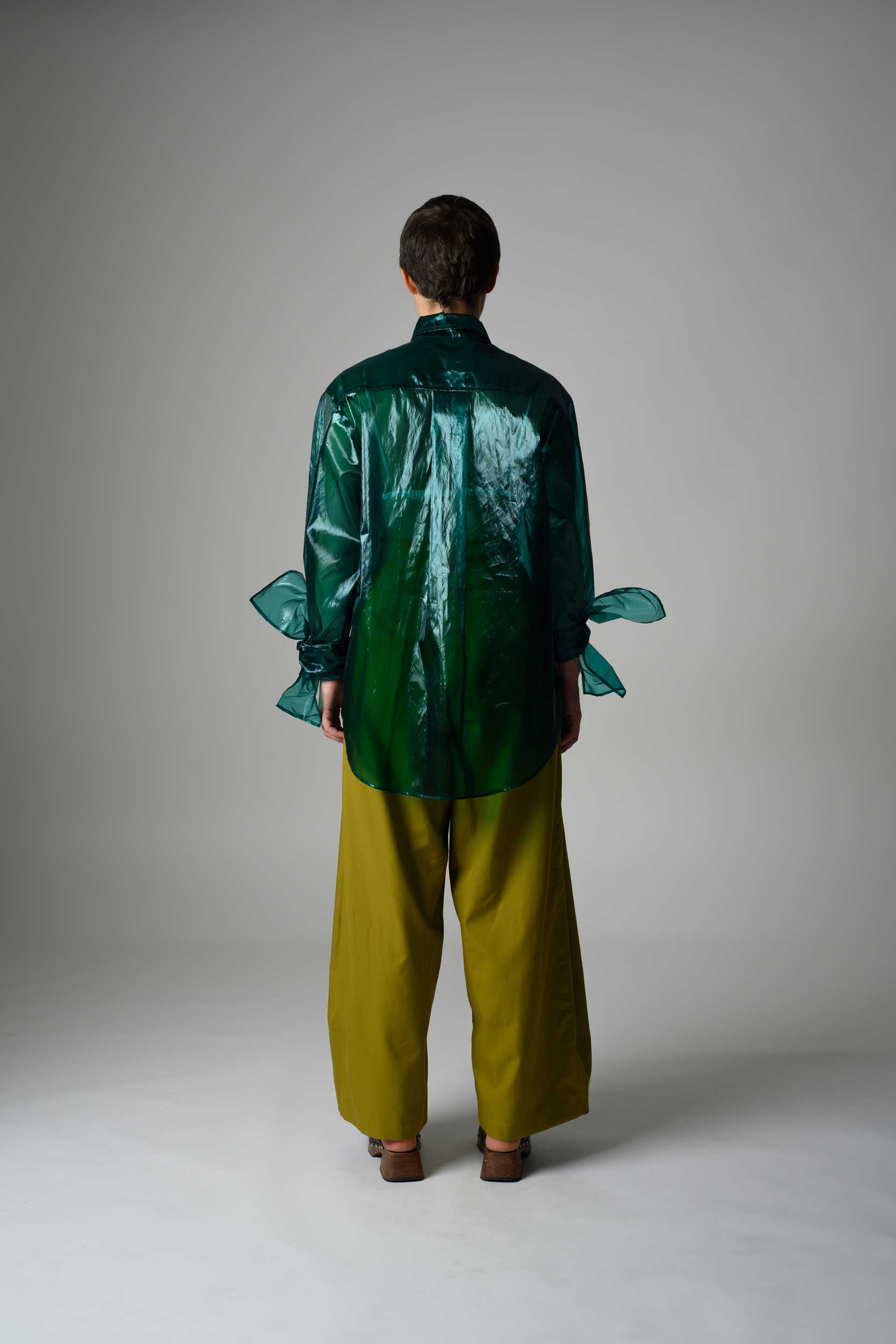 oversized cut, overlong sleeves with bow cuffs, breast pocket, signature button, french seam finishing