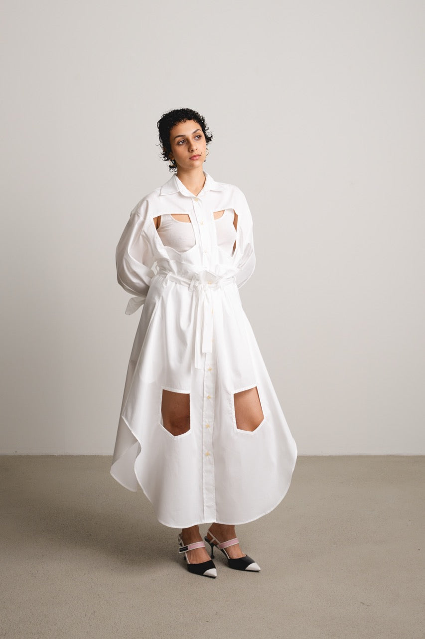 shirt shaped skirt, onesize, adjustable with belt, side seam pockets, shirt pocket at front, functional button rows on front and back, french seam finishing, pocket shaped cutouts