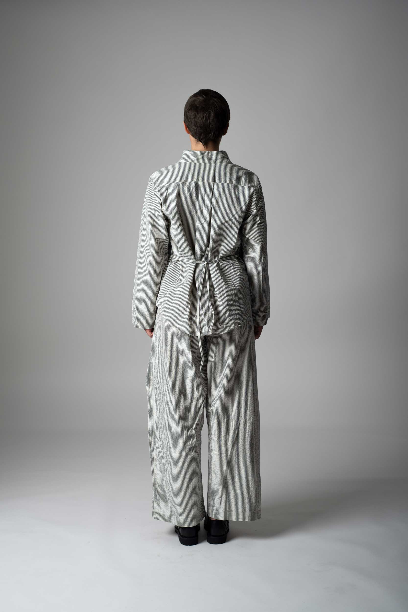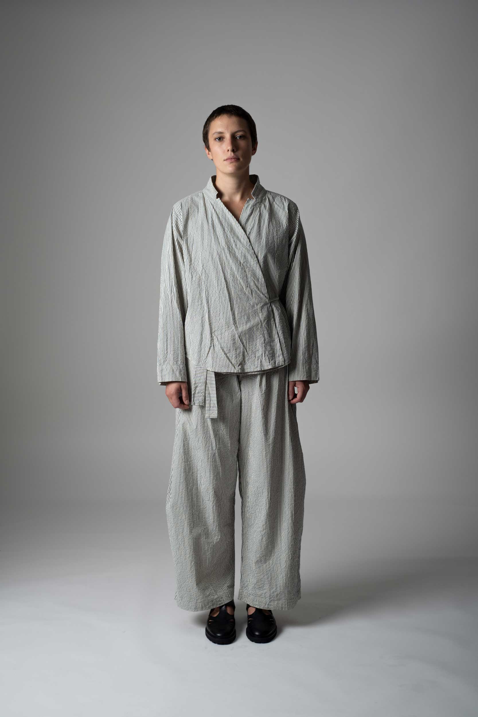 wrap shirt, long sleeves, closes with tie belt, can be worn as a blouse or as a light jacket