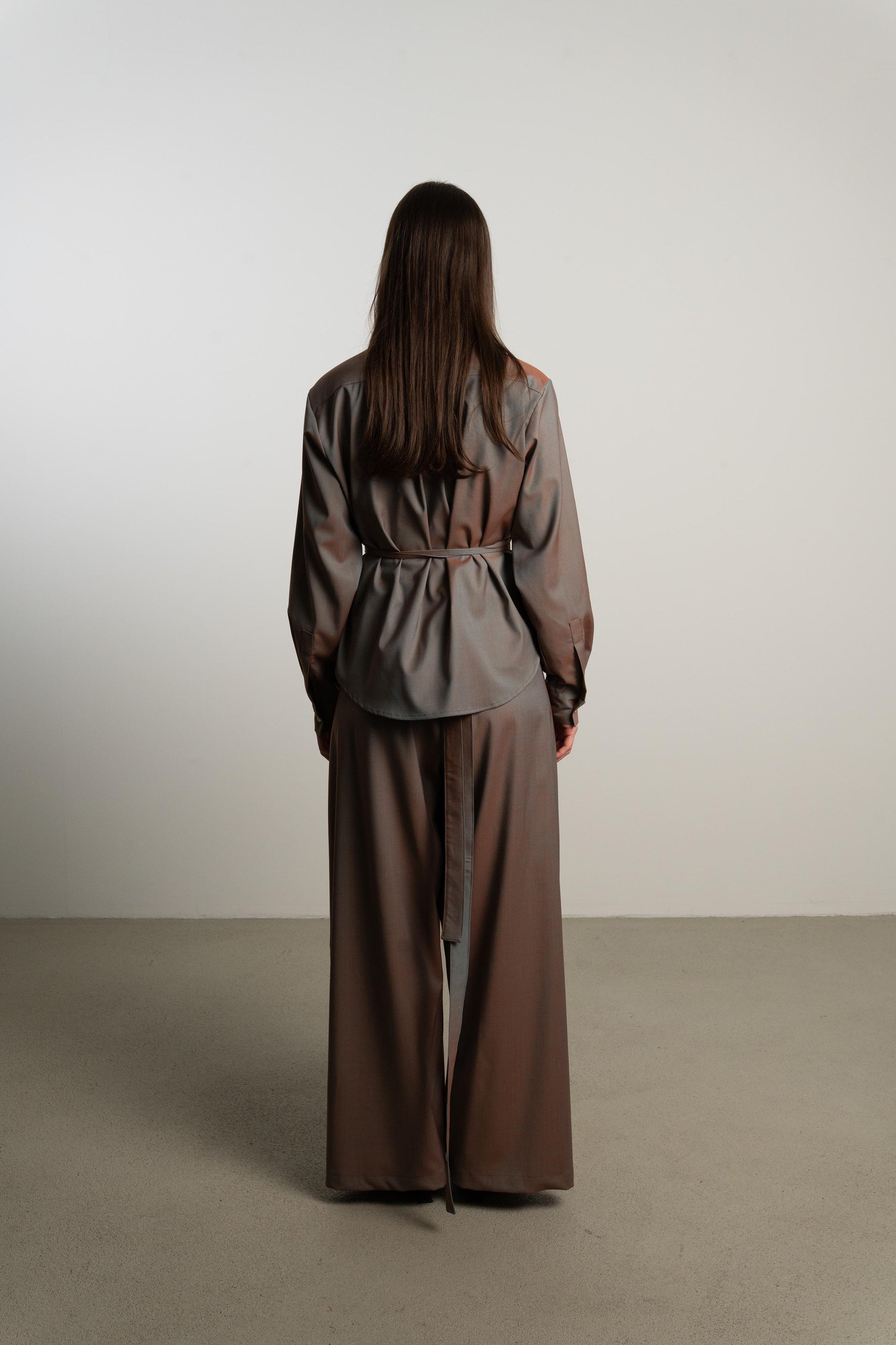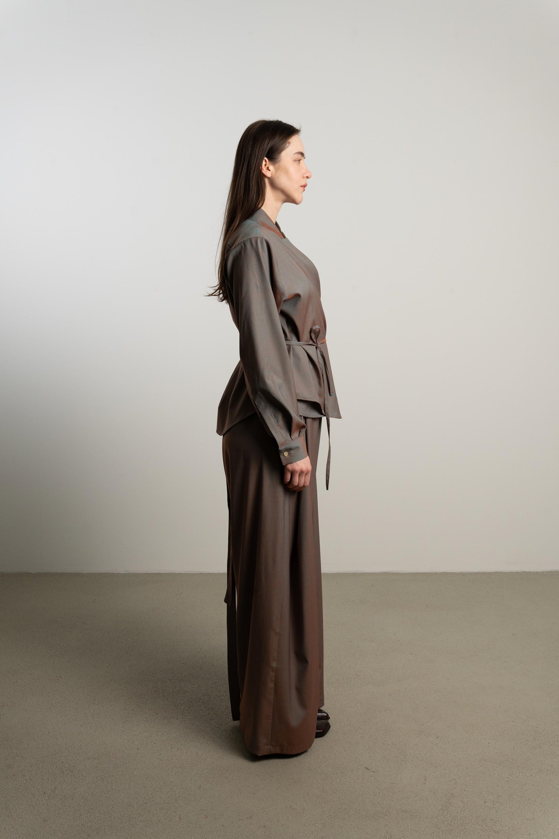 wrap shirt with stand-up revers, long sleeves with shirt cuffs, closes with tie belts, can be worn as blouse or as light jacket